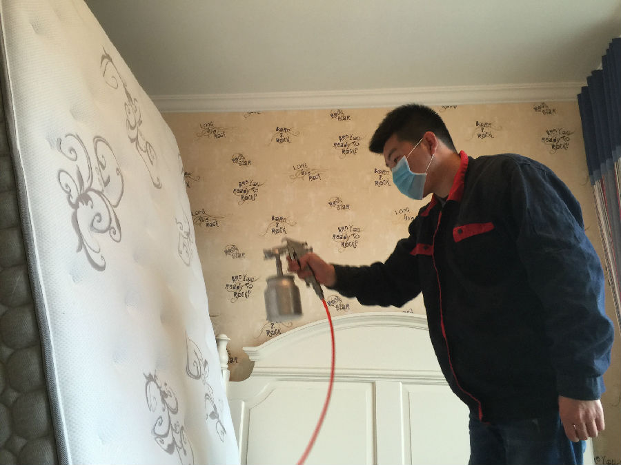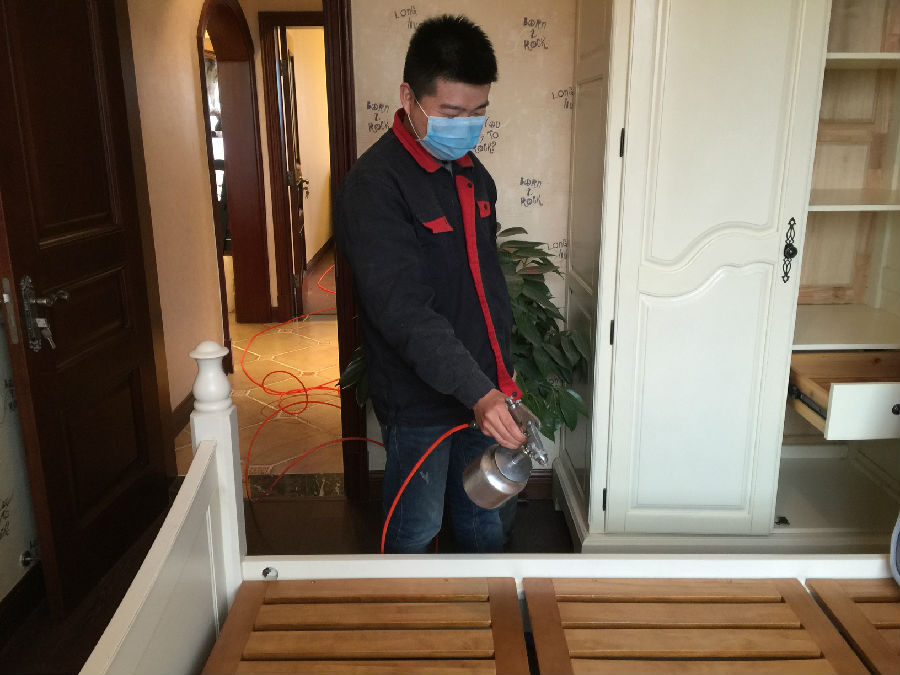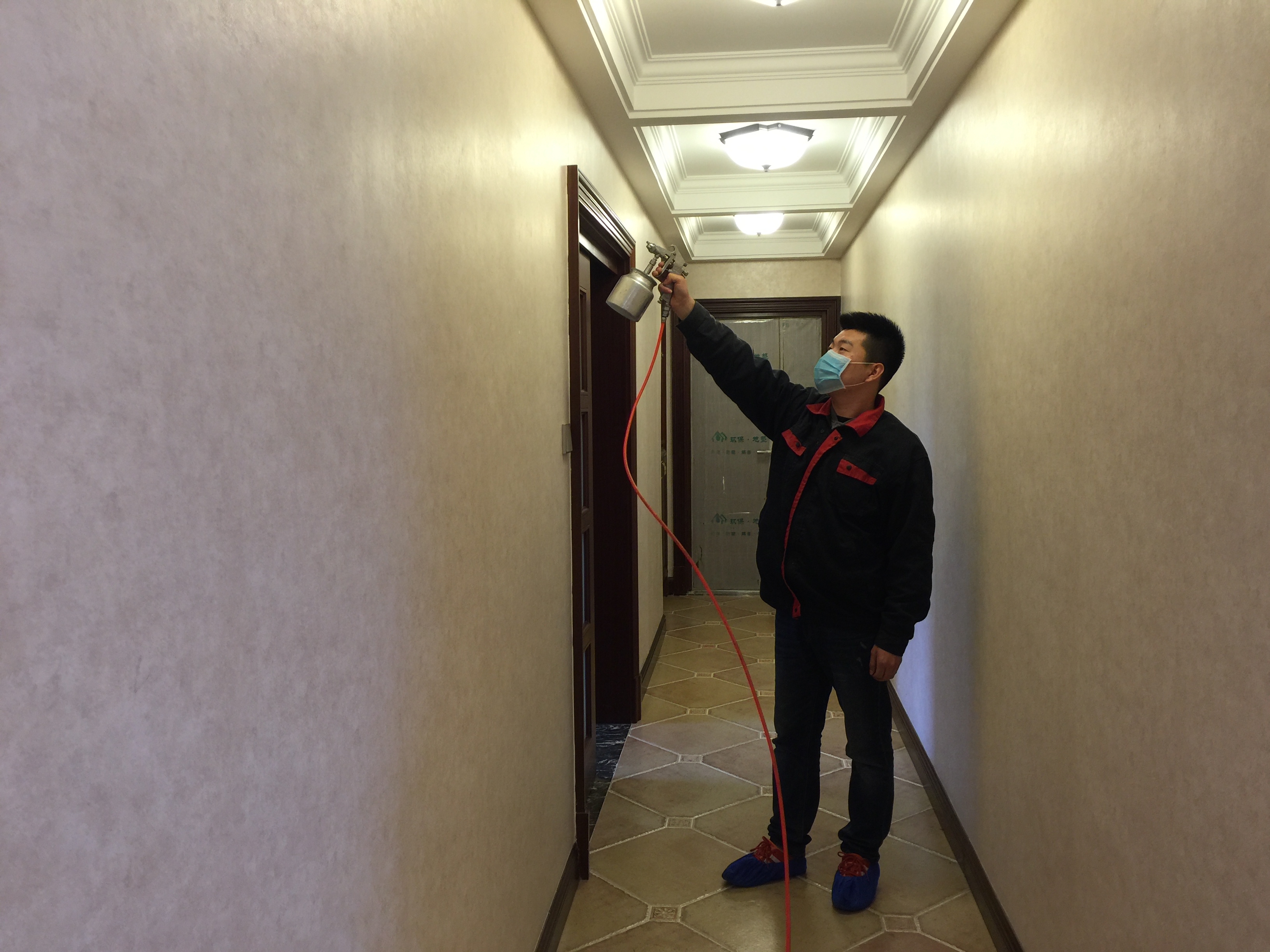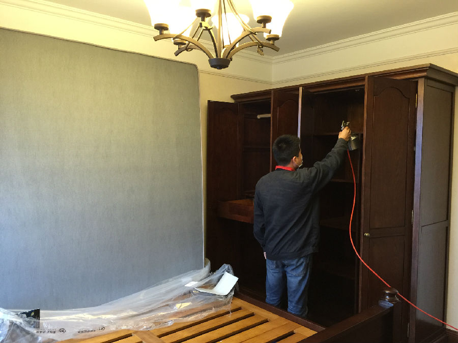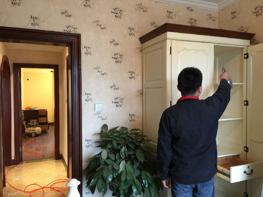 愛(ài)家除醛的工作人員為客廳中的壁紙門框等污染源進(jìn)行專項(xiàng)治理。