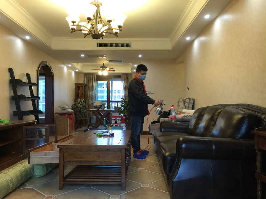 愛(ài)家除醛的工作人員為客廳中的皮革類沙發(fā)做專項(xiàng)治理。
