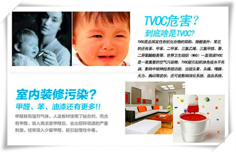 TVOC的主要成份包括:苯系物、有機氯化物、氟里昂系列、有機酮、胺、醇、醚、酯、酸和石油烴化合物等。由此可見,TVOC對人體有害是毋庸置疑的。然而,現(xiàn)實生活中,很多人只知道甲醛,認為裝修污染只有甲醛對人體危害最大,這就大錯而特錯了。其實,裝修污染中除了甲醛之外,還有TVOC、苯、氨等如果超標的話,一樣的會給人體帶來危害,所以不要以為裝修污染只要甲醛沒有超標就行了。